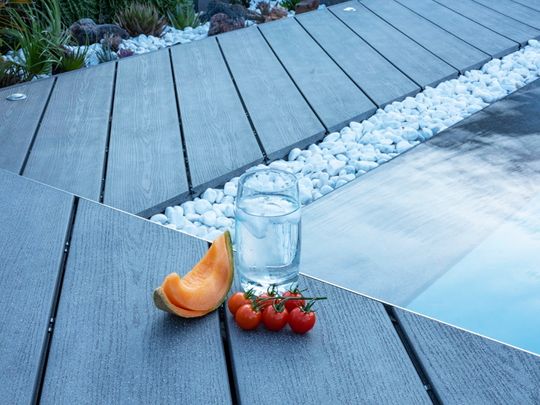 Letnią nowością, która posłuży długie lata, jest kolekcja Line marki Gardin. To koekstrudowane komorowe deski kompozytowe drugiej generacji na bazie żywicy PVC. Uwagę przykuwa ich efektowna szerokość - aż 18 cm! A ona z kolei przekłada się na elegancki wygląd przy umiejscowieniu wzdłuż basenu (deski dostępne w długości na wymiar). To również tańszy montaż — nawet o 24%. Mniej klipsów, mniej pracy. Ryflowana oraz szczotkowana powierzchnia odprowadza wodę i działa antypoślizgowo.