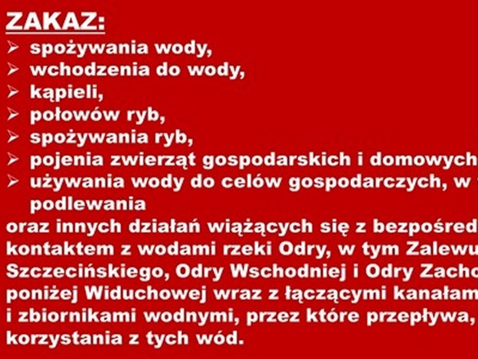 Zakaz dotyczy: spożywania wody, wchodzenia do wody, kąpieli, połowów ryb, spożywania ryb, pojenia zwierząt gospodarskich i domowych, używania wody do celów gospodarczych, w tym podlewania, oraz innych działań wiążących się z bezpośrednim kontaktem z wodami rzeki Odry, w tym Zalewu Szczecińskiego, Odry Wschodniej i Odry Zachodniej poniżej Widuchowej wraz z łączącymi kanałami i zbiornikami wodnymi, przez które przepływa, a także korzystania z tych wód.