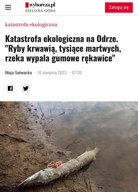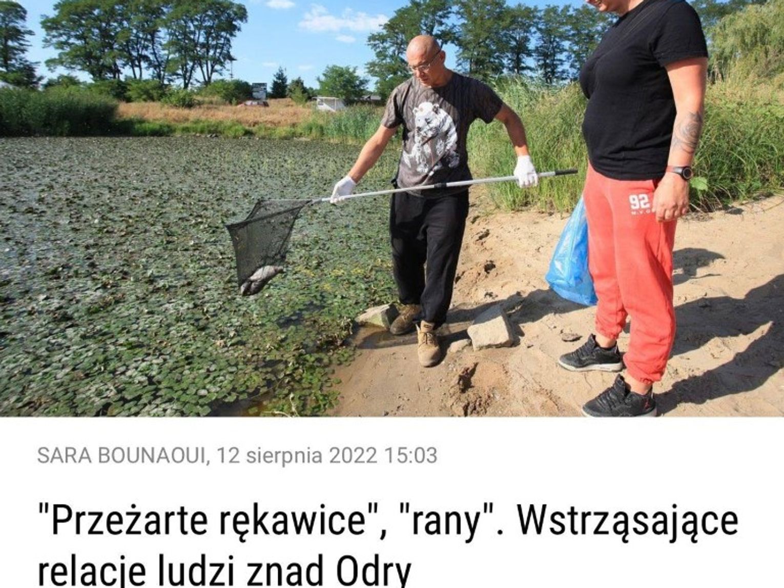 - "Następnie Odrą zaczęły płynąć tysiące martwych ryb, woda wydzielała zapach chloru i ścieków, wypalając gumowe rękawice osób zbierających ryby"