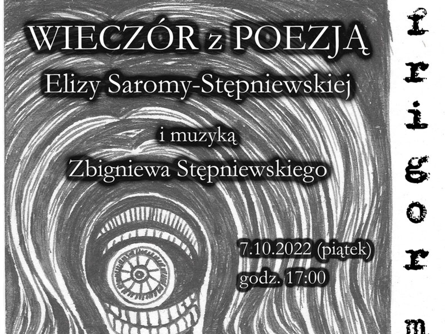 Spotkanie z poezją Elizy Saromy-Stępniewskiej i muzyką Zbigniewa Stępniewskiego. Wieczór słowa i dźwięku, związany z promocją najnowszego zbioru wierszy Elizy – „Frigor mortis”, dwujęzycznego tomiku-galerii (z angielskimi wersjami utworów pióra samej autorki), ilustrowanego jedynymi w swoim rodzaju rysunkami i obrazami Alicji Saromy. A właściwie, poniekąd, dwóch tomików, jako że poprzedni – „Jaśnie, półcienie i ciemnie” – w wyniku splotu wielu okoliczności również nie miał jeszcze oficjalnej premiery. Podczas spotkania można będzie nabyć książki autorki.