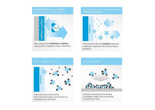 Farba Baumit IonitColor, wykorzystując naturalną wilgotność powietrza, aktywnie wytwarza w pomieszczeniu dobroczynne jony, które naturalnie występują tylko w przyrodzie. Działają one jak magnes na zanieczyszczenia unoszące się w powietrzu, wiążąc je w większe grupy, które pod wpływem własnego ciężaru opadają na podłogę, a nie przedostają się do dróg oddechowych. Dopełnieniem całości są masy szpachlowe Baumit IonitFinish i Baumit IonitFino. Nie tylko zapewniają wysokiej jakości, gładkie powierzchnie pod malowanie, ale dodatkowo regulują wilgotność powietrza we wnętrzach, utrzymując ją na poziomie optymalnym dla zdrowia mieszkańców, jak i dla produkcji jonów przez farbę Baumit IonitColor. To właśnie wilgotność powietrza sprawia, że stężenie jonów jest najwyższe przy wodospadach, nad morzem, w górach czy w lasach i to właśnie w tych miejscach najlepiej nam się myśli i oddycha.