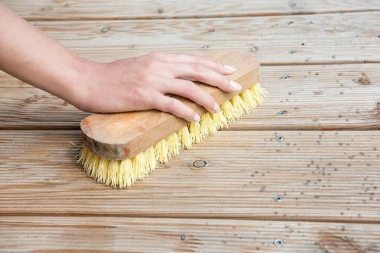 Zabezpieczenie aplikujemy bezpośrednio po montażu. Jeżeli od tego momentu minęło już trochę czasu, to przed olejowaniem dokładnie czyścimy całą powierzchnię. Zanieczyszczenia powierzchniowe sprzątamy za pomocą twardej szczotki z tworzywa. Następnie myjemy deski przy użyciu odpowiednich środków i porządnie spłukujemy. Teraz czekamy do wyschnięcia, a jeśli na wierzchu pozostał półprzezroczysty film — usuwamy go przed dalszą obróbką. Ewentualnie szlifujemy wszystko cienkim papierem ściernym, żeby uzyskać jednolitą powierzchnię.