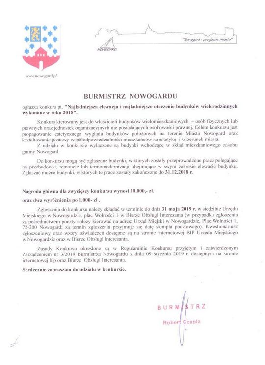 Zasady Konkursu określone są w Regulaminie Konkursu przyjętym i zatwierdzonym Zarządzeniem nr 3/2019 Burmistrza Nowogardu z dnia 09 stycznia 2019 r. dostępnym na stronie internetowej bip oraz Biurze Obsługi Interesanta.