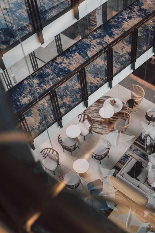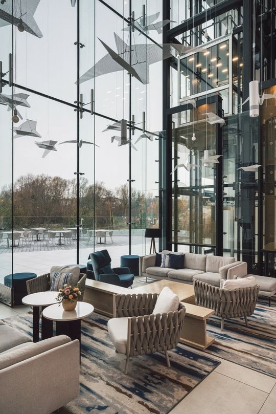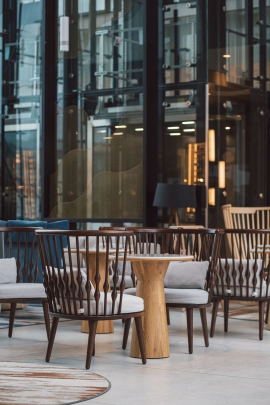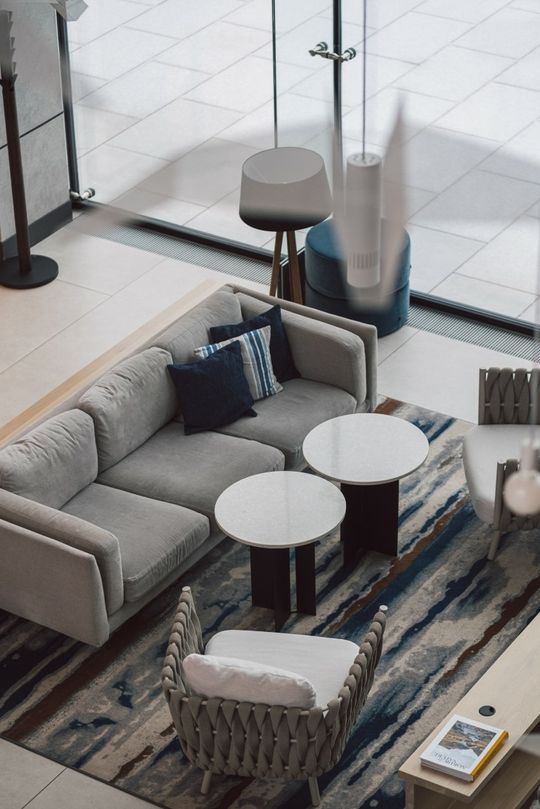 W nagrodzonym hotelowym lobby dominują odcienie szarości i beżów, przełamane kontrastującymi, niebieskimi akcentami. W projekcie pojawiają się również elementy z ciemnego, orzechowego drewna, kamienne blaty oraz tkaniny o grubych splotach.