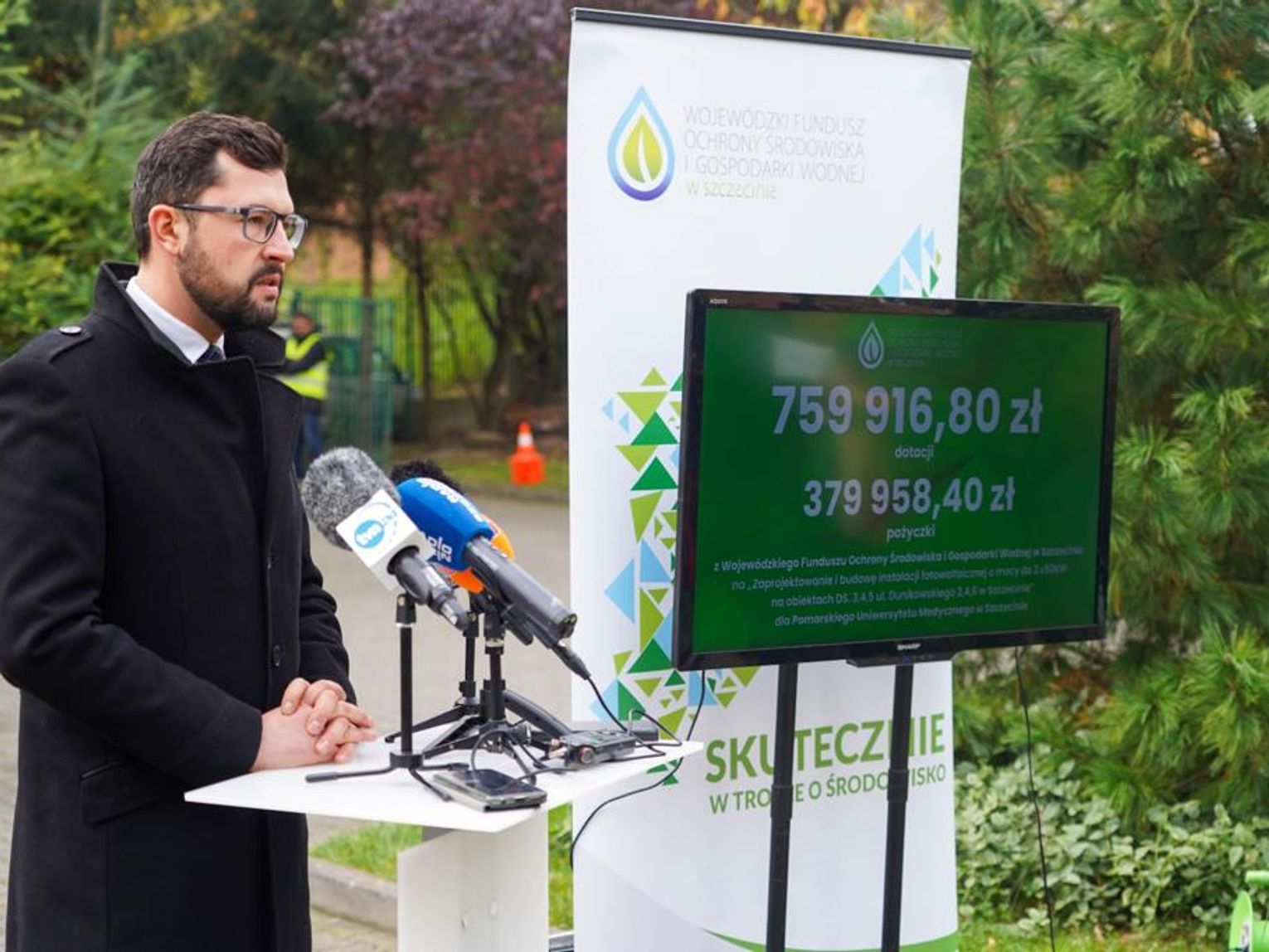 - Trzy domy studenckie PUMu–dzięki wsparciu Funduszu–są zasilane zieloną energią, a efekty są korzystne nie tylko dla budżetu uczelni, ale i środowiska. Panele rocznie produkują ponad 140 MWh czystej, zielonej energii, a to atmosfery nie trafia prawie 120 ton dwutlenku węgla. Wszyscy chcemy oddychać dobrej jakości powietrzem, dlatego cieszy inicjatywa Uniwersytetu, który inwestuje w odnawialne źródła energii - mówi Marek Subocz – Prezes Zarządu WFOŚiGW w Szczecinie. W briefingu prasowym dotyczącym inwestycji wzięli udział także: Wicewojewoda Zachodniopomorski Tomasz Wójcik, Rektor PUM prof. Bogusław Machaliński i Kanclerz PUM Krzysztof Goralski.