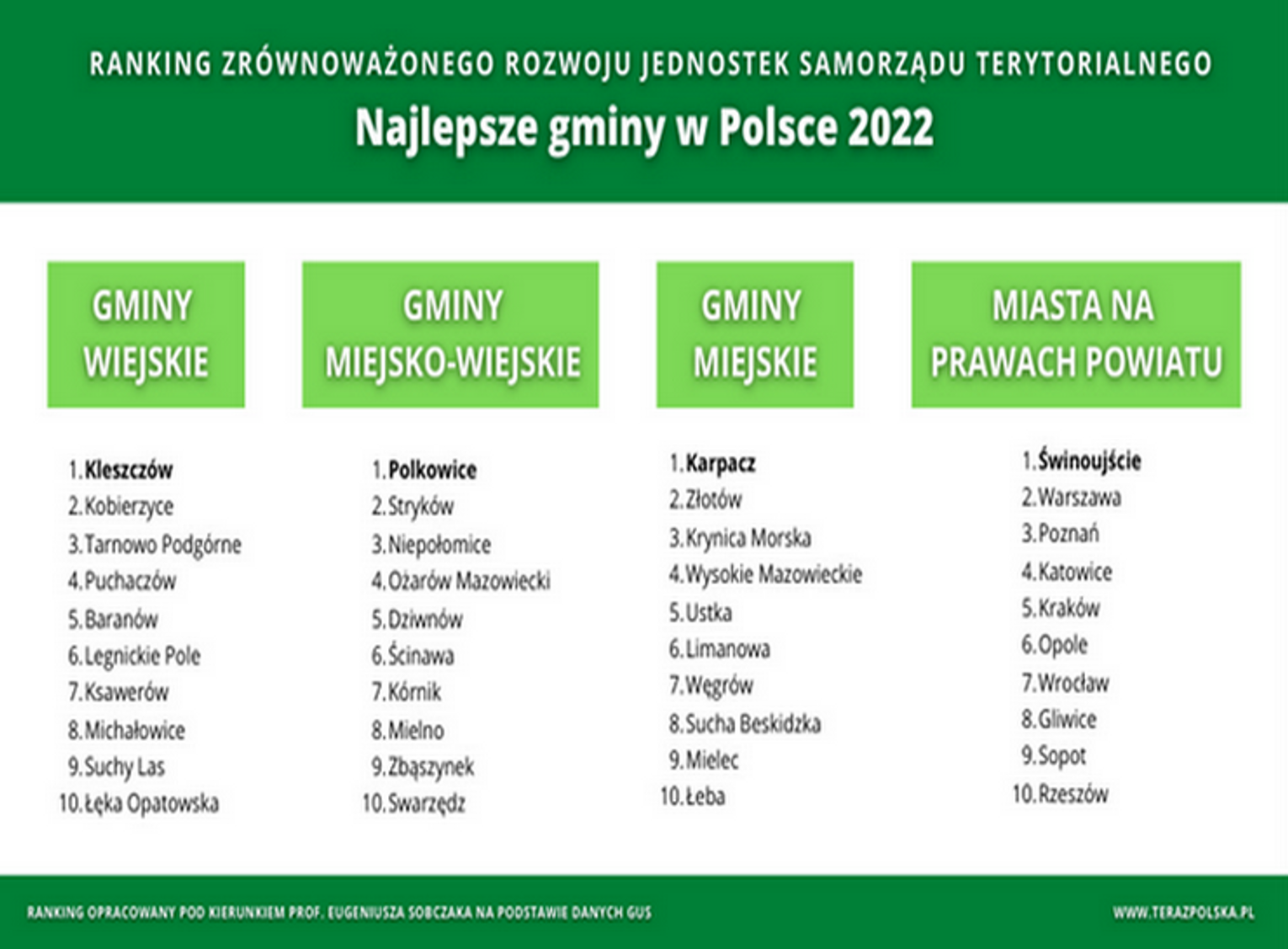 Ranking Zrównoważonego Rozwoju Jednostek Samorządu Terytorialnego opracowywany przez zespół prof. Eugeniusza Sobczaka powstaje w oparciu o analizę wskaźników obejmujących trzy obszary rozwoju: gospodarczy, społeczny i ochrony środowiska. Ranking uwzględnia wszystkie polskie miasta i gminy. Materiałem źródłowym są niezależne dane Głównego Urzędu Statystycznego, dzięki czemu wyniki rankingu odzwierciedlają, w sposób wiarygodny i przekrojowy, rozwój polskich jednostek samorządu lokalnego i wskazują liderów w podziale na gminy wiejskie, miejsko-wiejskie, miejskie oraz miasta na prawach powiatu.