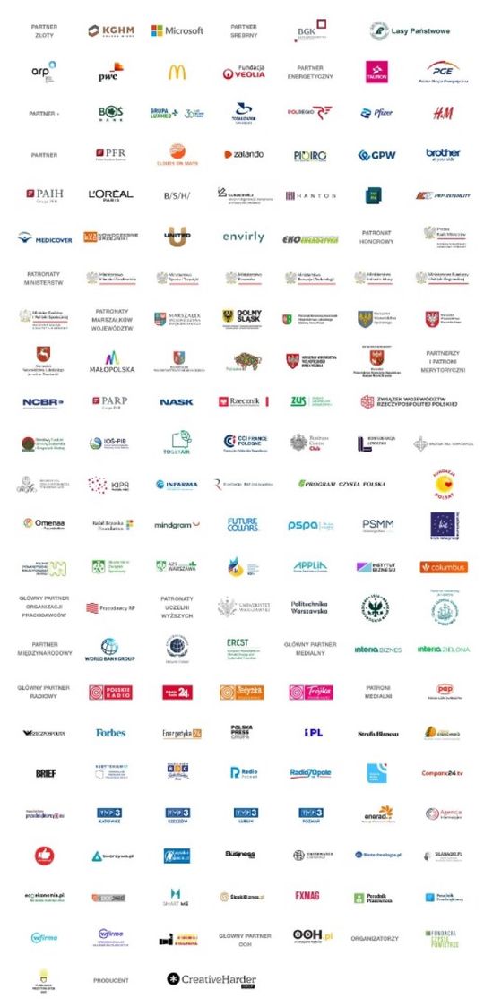 PARTNER ZŁOTY: KGHM Polska Miedź, Microsoft PARTNER SREBRNY: BGK Bank Gospodarstwa Krajowego, Lasy państwowe, ARP Agencja Rozwoju Przemysłu, PWC, McDonald's, Fundacja VEOLIA PARTNER ENERGETYCZNY: Tauron, PGE PARTNER+: BOŚ Bank, Grupa LuxMed, Totalizator Sportowy, POLREGIO, Pfizer, H&M PARTNER: PFR Polski Fundusz Rozwoju, Clouds on Mars, Zalando, PIOIRO, GPW, BROTHER, PAIH Grupa PFR, L’oreal, BSH, Sieć Badawcza Łukasiewicz, Hanton, EkoPak, PKP Intercity, Medicover, LUX RAD, United, envirly, EkoEnergetyka PATRONAT HONOROWY: Prezes Rady Ministrów Mateusz Morawiecki PATRONATY MINISTERSTW: Ministerstwo Klimatu i Środowiska, Ministerstwo Sportu i Turystyki, Ministerstwo Finansów, Ministerstwo Rozwoju i Technologii, Ministerstwo Infrastruktury, Ministerstwo Funduszy i Polityki Regionalnej, Ministerstwo Rodziny i Polityki Społecznej PATONATY MARSZAŁKÓW WOJEWÓDZTW: Związek Województw Rzeczpospolitej Polskiej, Marszałek Województwa: dolnośląskiego, świętokrzyskiego, lubuskiego, opolskiego, mazowieckiego, lubelskiego, małopolskiego, podkarpackiego, podlaskiego, śląskiego, wielkopolskiego, warmińsko-mazurskiego PARTNERZY I PATRONI MERYTORYCZNI: TOGETAIR, CCIFP Francusko-Polsko Izba Gospodarcza, Business Centre Club, NCBR Narodowe Centrum Badań i Rozwoju, Fundacja Republikańska, Stowarzyszenie Program Czysta Polska, Fundacja Polsat, Mindgram, PSMM Press-Service Monitoring Mediów, Klub Integracji Europejskiej, KIPR Konfederacja Inicjatyw Pozarządowych Rzeczypospolitej Polskie NGO, Rzecznik Małych i Średnich Przedsiębiorców, , Infarma, AZS Warszawa, Akademicki Związek Sportowy, Polskie Stowarzyszenie Magazynowania Energii, Omenaa Fundation, Rafał Brzoska Fundation, ZUS Zakład Ubezpieczeń Społecznych, Krajowa Izba Gospodarcza, PARP, Instytut Biznesu, IOŚ-PIB, Narodowy Fundusz Ochrony Środowiska i Gospodarki Wodnej, Polskie Regiony, Polski Komitet Olimpijski, PSPA Polskie Stowarzyszenie Paliw Alternatywnych, Regionalna Izba Gospodarcza w Katowicach, Columbus, NASK, Igrzyska Europejskie Kraków Małopolska, APPLIA, Konfederacja Lewiatan, Future Collars GŁÓWNY PARTNER ORGANIZACJI PRACODAWCÓW: Pracodawcy RP PATRONATY UCZELNI WYŻSZYCH: Uniwersytet Warszawski, Szkoła Główna Handlowa w Warszawie, Akademia Górniczo Hutnicza w im. Stanisława Staszica w Krakowie, Politechnika Warszawska, Szkoła Główna Gospodarstwa Wiejskiego w Warszawie PARTNER MIEDZYNARODOWY: World Bank Group, UN Global Compact, ERCST European Roundtable on Climate Change and Sustainable Transition GŁÓWNY PARTNER MEDIALNY: Interia Biznes, Interia Zielona GŁÓWNE PORTALE INTERNETOWE: Wirtualna Polska, Money.pl GŁÓWNY PARTNER RADIOWY: Polskie Radio, Polskie Radio Program I, Polskie Radio Program III, Polskie Radio24 PATRONI MEDIALNI: PAP Polska Agencja Prasowa, Rzeczpospolita, Forbes, Energetyka 24, Polska Press Grupa, I.pl, Strefa Biznesu, Brief, Teraz Środowisko, Audytorium 17, Radio dla Ciebie, Radio Poznań, Radio Opole, Radio Lublin, Comparic24.tv, Przedsiębiorcy@eu, TVP3 Katowice, TVP3 Rzeszów, TVP3 Lublin, TVP3 Katowice, Enerad.pl, Agencja Informacyjna, okrakow.pl, Tworzywa.pl, Wysokie Napięcie, Biznes Hub, Obserwator Gospodarczy, Biotechnologia.pl, Siła Nauki, Ecoekonomia.pl, Pod prąd, Smart Me, ŚlaskiBiznes.pl, FXmag, Poradnik Pracownika, Poradnik Przedsiębiorcy, wFirma, Wiadomości Warszawskie GŁÓWNY PARTER OOH: OHH.PL