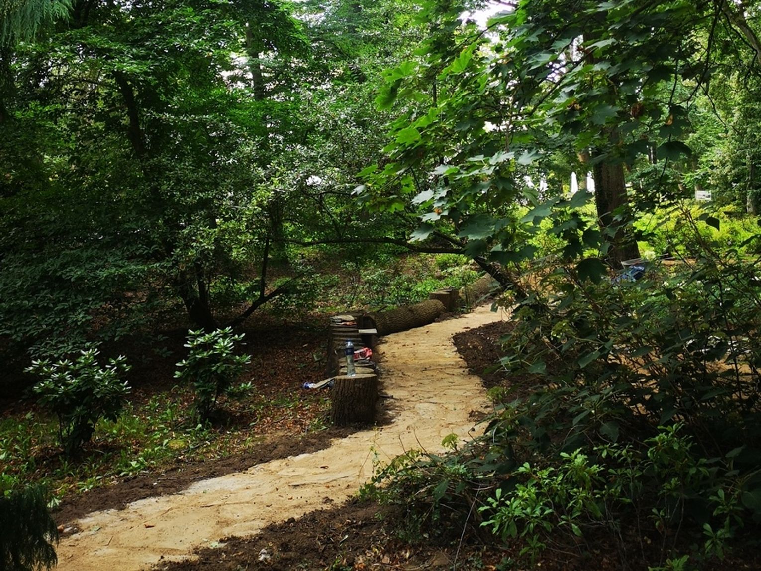 Na fotografiach przedstawiono ogród wiecznie zielony przed rozpoczęciem budowy ścieżek oraz po zakończeniu prac.