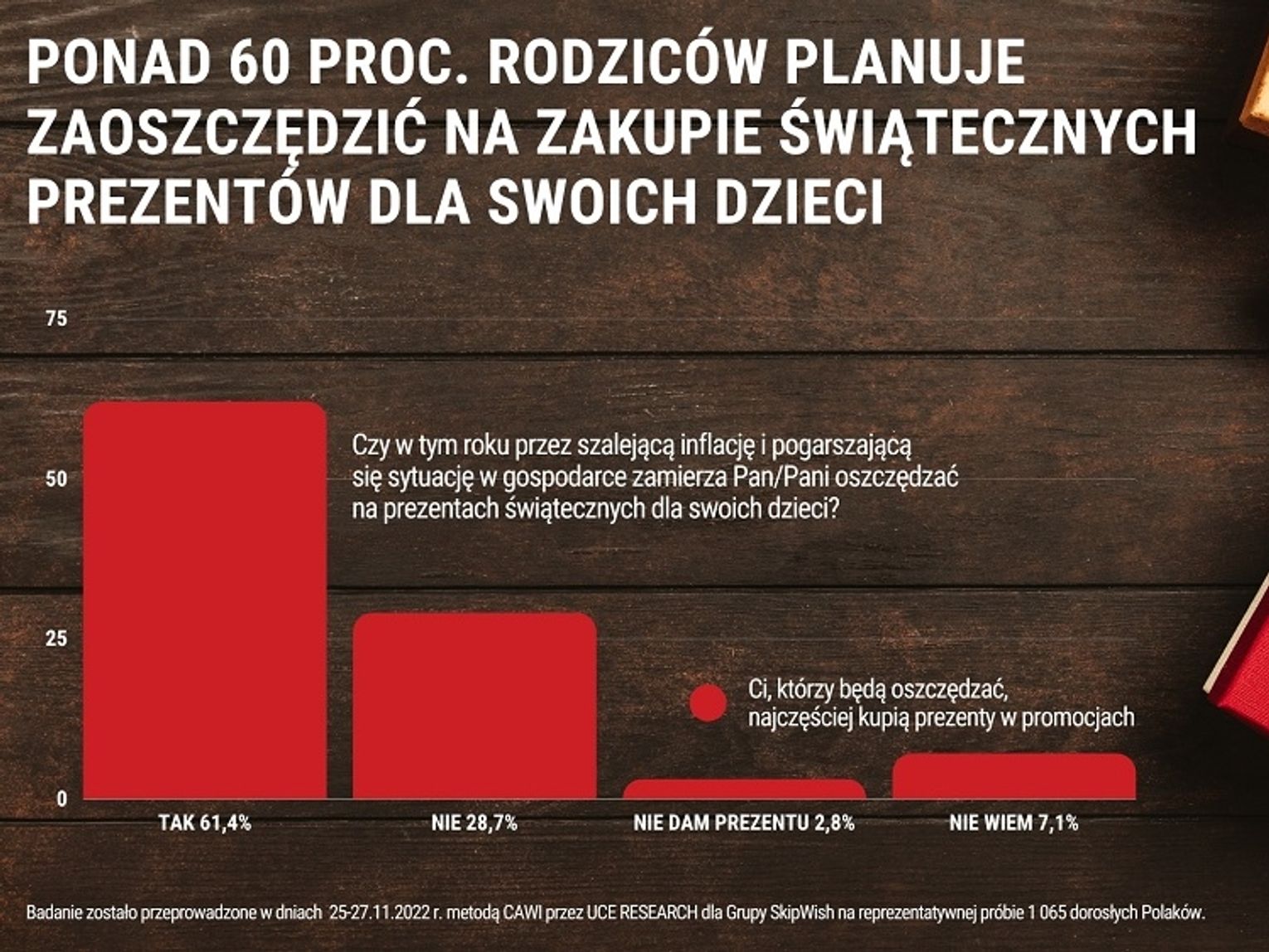 Przez szalejącą inflację i pogarszającą się sytuację w gospodarce, 61,4% Polaków zamierza w tym roku oszczędzać na prezentach świątecznych dla swoich dzieci. Z kolei 28,7% nie planuje takiego zaciskania pasa. Natomiast 7,1% ankietowanych nie potrafi się określić, a 2,8% nie da w ogóle prezentów. Badanie zostało przeprowadzone przez UCE RESEARCH dla Grupy SkipWish na próbie 1065 Polaków mających dzieci.