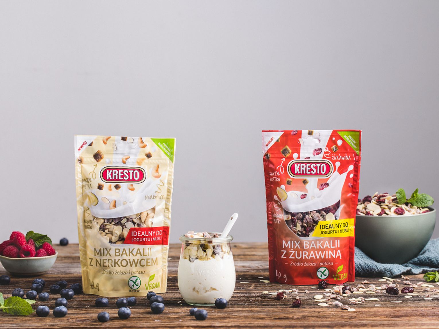 Kompozycje KRESTO są gotowe do spożycia od razu po otwarciu opakowania i nie wymagają obróbki termicznej. To idealne rozwiązanie dla osób, które cenią zbilansowane odżywianie, a jednocześnie nie dysponują o poranku zbyt dużą ilością czasu. Zarówno wersja z nerkowcem, jak i z żurawiną, posiada licencję wydaną przez Polskie Stowarzyszenie Osób z Celiakią i na Diecie Bezglutenowej.