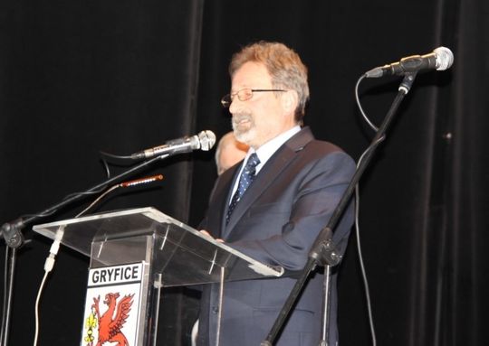 Burmistrz Gryfic Andrzej Szczygieł bardzo serdecznie przywitał zaproszonych gości a następnie podsumował dokonania minionego roku. Jednym z głównych działań były przedsięwzięcia i inicjatywy związane z obchodami 100 rocznicy Odzyskania przez Polskę Niepodległości, było to symboliczne sadzenie kwiatów, dębów, spotkania, akademie środowiskowe i apele. Podsumowanie minionego roku to także a może nawet przede wszystkim dokonania inwestycyjne w dziedzinie gospodarki i poprawy komfortu życia mieszkańców, to m.in. oddanie do użytku Przedszkola na Osiedlu XXX lecia, budowa mieszkań komunalnych przy ul. Jana Dąbskiego do których już wkrótce wprowadzą się oczekujący na mieszkanie komunalne mieszkańcy. Podjęto kolejne działania dla przygotowania kolejnych inwestycji – to uzbrojenie kolejnych terenów pod budownictwo mieszkaniowe oraz rozbudowa infrastruktury sportowej. Dalsze plany inwestycyjne to budowa kolejnego przedszkola przy ul. Sienkiewicza, stworzenie Dziennego Domu Seniora, budowa kolejnych świetlic wiejskich, kolejny etap rewitalizacji parku miejskiego, ale też modernizacja infrastruktury która wraz z upływem czasu wymaga dostosowania do nowych wymagań jak konieczność modernizacji miejskiej oczyszczalni ścieków oraz oświetlenia ulicznego. W planach inwestycyjnych pojawia się też bardzo ambitna inicjatywa budowy Gryfickiego Centrum Kultury. Nawiązując do tragedii w Gdańsku burmistrz apelował także o obniżenie zarówno w debacie publicznej jak i relacjach międzyludzkich językowej agresji i wyeliminowanie “mowy nienawiści” z jaką spotykamy się także w naszej gminie.