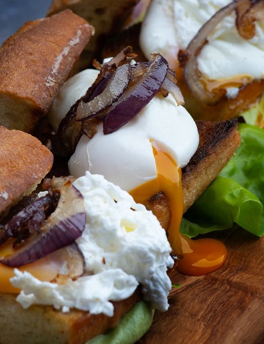 Najpierw robimy grzanki. W tym celu bagietkę tniemy na kilka kawałków, o długości około 10 cm każdy. Na patelni podgrzewamy masło. Kawałki bagietki rozcinamy i podgrzewamy wewnętrzną stronę do zarumienienia. Potem przygotowujemy jajko w koszulce – doprowadzamy garnek z wodą do wrzenia, dodajemy trochę octu, robimy wir w garnku za pomocą łyżki i wlewamy całe jajko. Jajko powinno mieć w środku płynne żółtko. Po około 3 minutach wyciągamy jajko i płuczemy w naczyniu z zimną wodą. Cebulę kroimy w krążki i podgrzewamy na patelni dodając masło i miód. Karmelizujemy, aż zmięknie. Grzanki nacieramy czosnkiem, kładziemy jajko, solimy i pieprzymy, dodajemy na wierzch kilka krążków karmelizowanej cebuli, przykrywamy drugą częścią bagietki. Podajemy na sałacie.