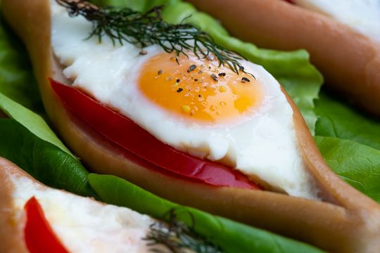 Parówkę rozcinamy wzdłuż, pozostawiając nie rozcięte dwa końce na długości około 1 cm. Kładziemy ją na rozgrzaną patelnię, na której roztapiamy trochę masła. Rozchylamy wnętrze parówki w miejscu nacięcia i delikatnie wlewamy jajko. Podgrzewamy, aż się zetnie. Ściągamy z patelni, solimy i dodajemy pasek świeżej czerwonej papryki na krawędzi pomiędzy jajko i parówkę. Podajemy na liściu sałaty.