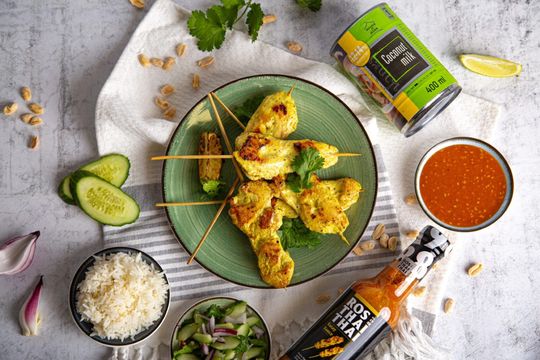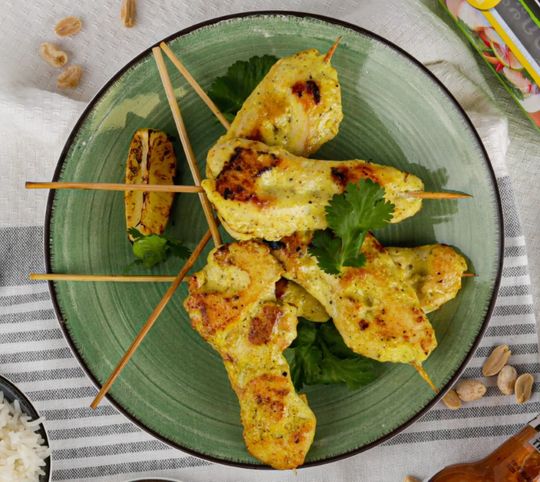 1. Wymieszaj wszystkie przyprawy z mleczkiem kokosowym, łyżką oleju i zamarynuj mięso, odstaw na 15 minut. Następnie nadziej kurczaka na patyczki do szaszłyków.