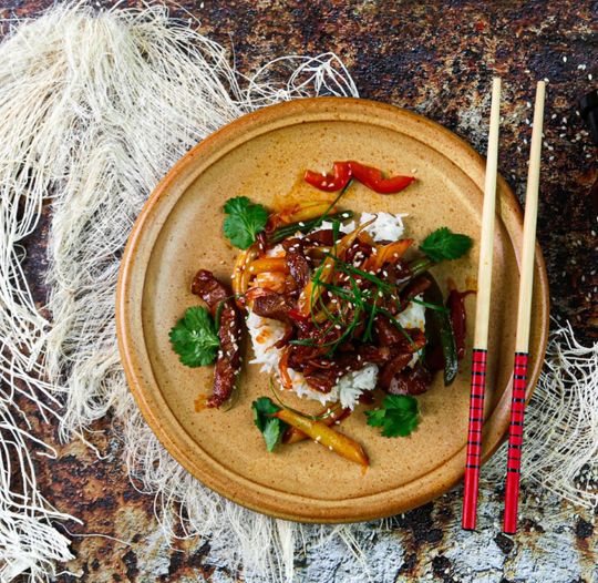 - Do rozgrzanego woka wlej olej i podsmaż pokrojone warzywa przez 3-4 minuty, dodaj mięso i całość wymieszaj z pozostałą ilością marynaty. Wyłóż na talerze i posyp sezamem i dymką.