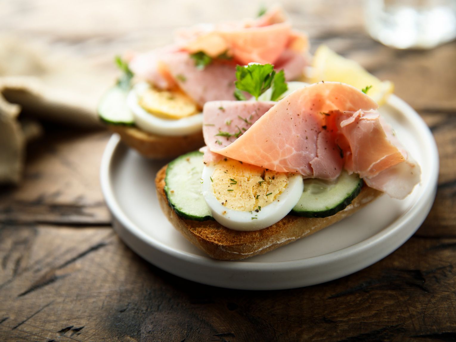 Przepis: pieczywo kroimy na mniejsze kawałki i cienko smarujemy masłem, przygotowujemy kilka plastrów wysokogatunkowej szynki, ogórka myjemy i kroimy na cienkie plasterki, ugotowane jajka kroimy w ten sam sposób odkładając plastry bez żółtka. Składniki układamy na pieczywie, doprawiamy solą i pieprzem, a na koniec posypujemy szczypiorkiem lub zieloną pietruszką.