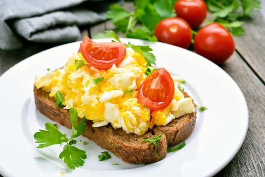 Przepis: ciemne pieczywo (może być tostowane) smarujemy cienko masłem albo skrapiamy oliwą, jajecznicę dla wzbogacenia smaku smażymy na cebuli przyprawiając solą i pieprzem, nakładamy grubą warstwę na pieczywo, przystrajamy ćwiartkami pomidorków koktajlowych, posypujemy zieloną pietruszką lub szczypiorkiem.