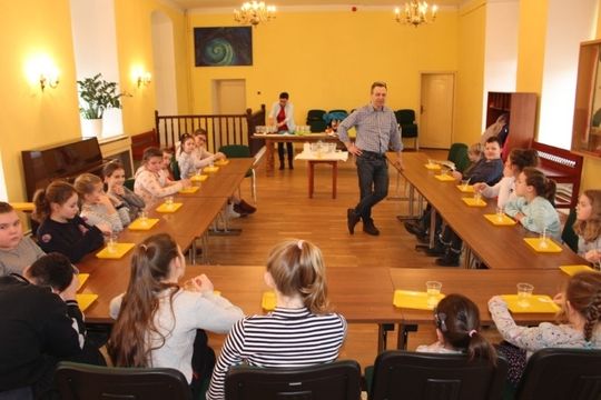 W trakcie kolejnego dnia „Ferii w Pałacu” gościliśmy „Pomysłową Fabrykę” z Koszalina, która na wesoło, zaskakująco prezentowała tajniki chemii. Czym jest emulgacja cieczy, roztwór nasycony i nienasycony, jak zrobić pastę słonia, dlaczego w serze są dziury? To tylko niektóre tajemniczo brzmiące chemiczne zadania, które w bardzo oryginalny i przystępny dla dzieci sposób wyjaśniali Państwo Kinga i Tomasz Pietruszyńscy, czyli bardzo wesoła i wybuchowa ” Pomysłowa Fabryka”. W tym dniu nie brakowało łamania sobie głów, bowiem czekały na nas jeszcze gry logiczne, planszowe, Quizy, zagadki…Bawimy się , ale też uczymy, na wesoło!