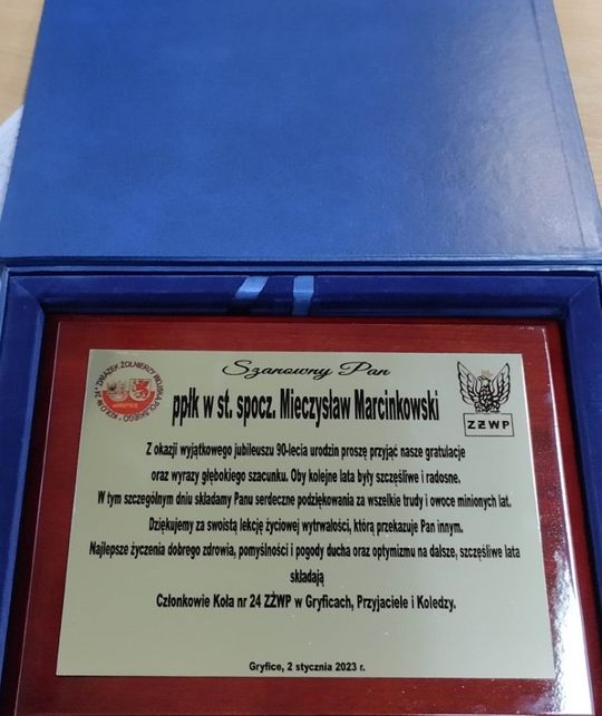 W dniu 15.02.2023 na walnym zebraniu Związku Żołnierzy Wojska Polskiego koła nr 24 im. I Armii Wojska Polskiego Prezes Zarządu płk w st. spocz. Krzysztof TOKARCZYK z okazji jubileuszu 90 urodzin uhonorował okolicznościowym ryngrafem od wszystkich członków koła dostojnego jubilata Kolegę