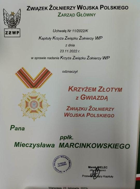Dodatkowo Honorowy członek naszego koła a jest nim Kolega Marcinkowski odebrał „Krzyż Złoty z Gwiazdą” który został przyznany przez Kapitułę Krzyża Związku Żołnierzy Wojska Polskiego w Warszawie.