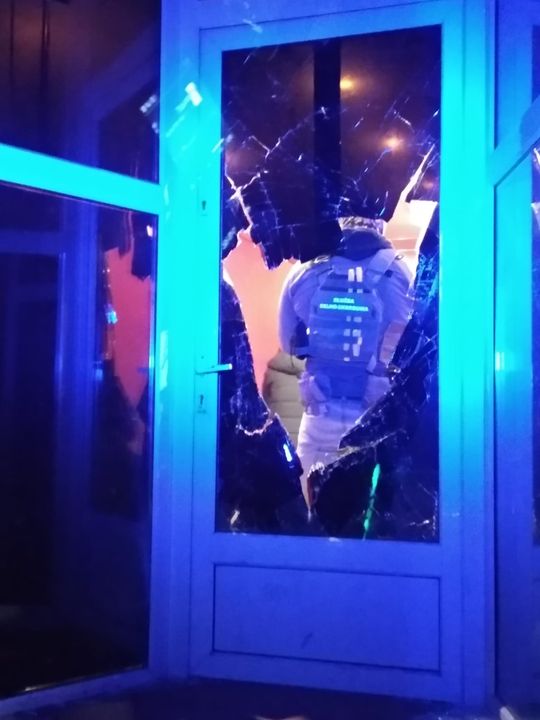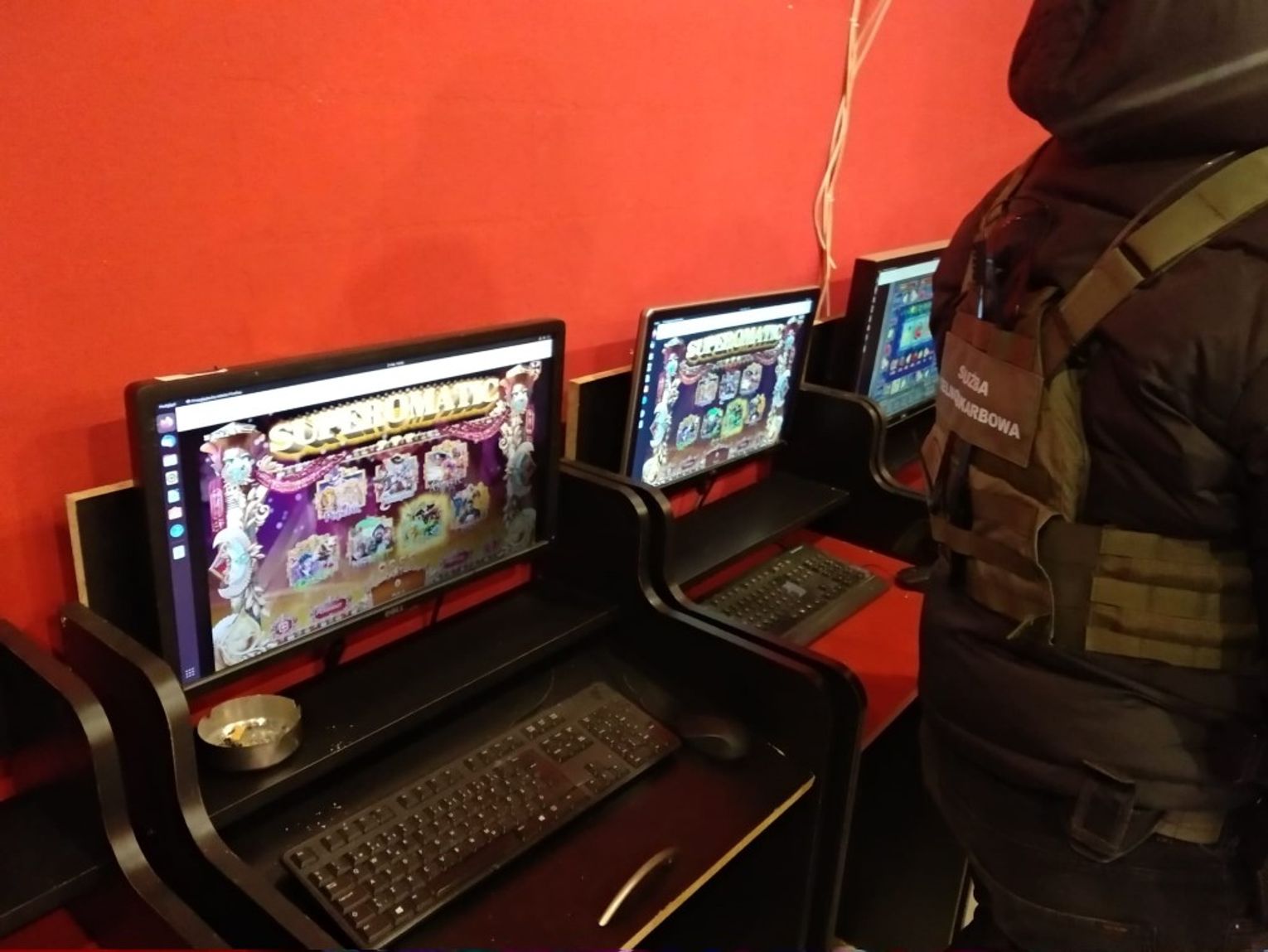 Funkcjonariusze Służby Celno-Skarbowej z ZUCS zamknęli nielegalny punkt hazardowy w Trzebiatowie. Nieoznakowany lokal mieścił się w centrum miasta i wyróżniał się oklejonymi na czarno szybami witryn. Lokal był monitorowany, a jego pracownicy wpuszczali klientów zweryfikowanych przez monitoring. Nasi funkcjonariusze niewątpliwie do tej grupy klientów nie należeli, dlatego konieczne było wybicie szyby w drzwiach, aby umożliwić wejście do środka.