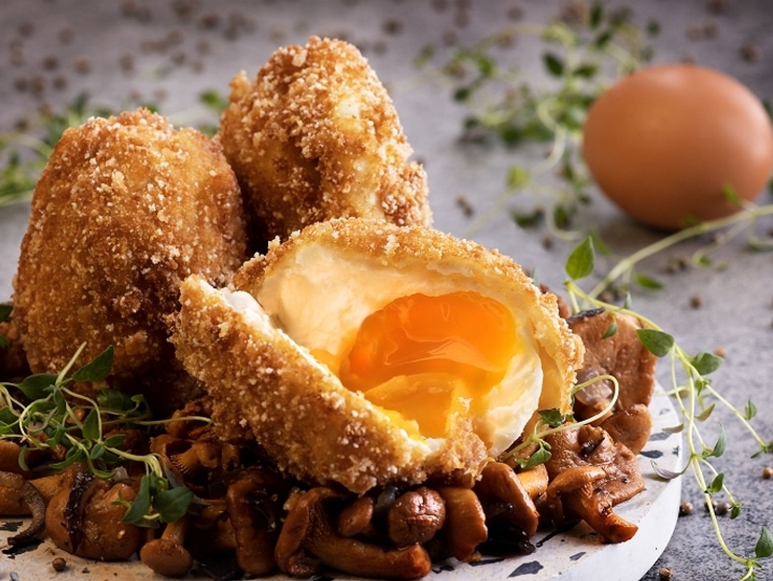 Na talerzu kładziemy kurki z cebulą, a na nich ustawiamy panierowane jaja. Ozdabiamy świeżymi ziołami lub kiełkami.