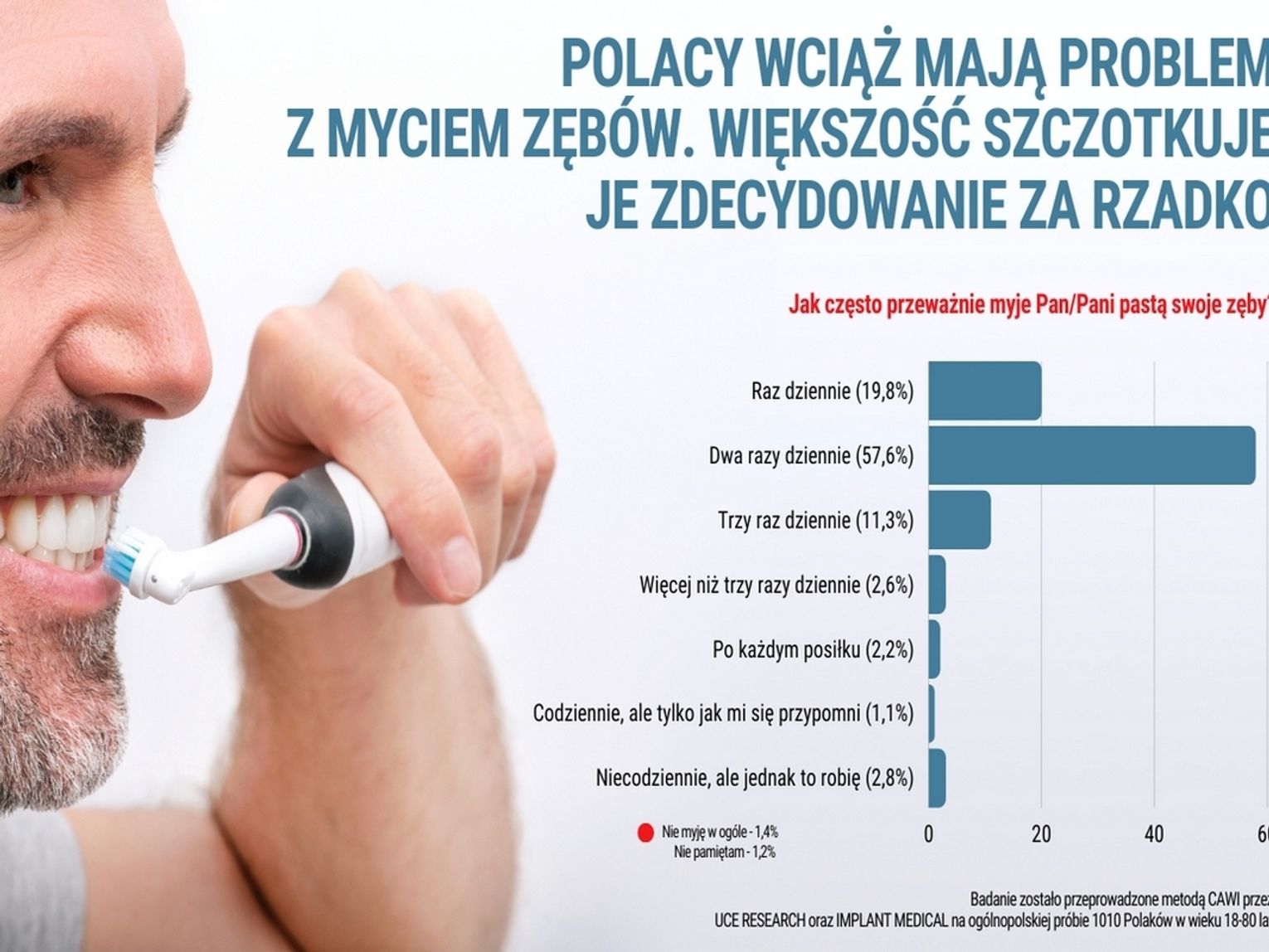 Z najnowszego badania opinii publicznej pt. „Jak często Polacy myją zęby?”, autorstwa UCE RESEARCH oraz IMPLANT MEDICAL, wykonanego na reprezentatywnej próbie ponad tysiąca dorosłych Polaków, wynika, że większość rodaków (57,6%) przeważnie czyści zęby pastą dwa razy dziennie.