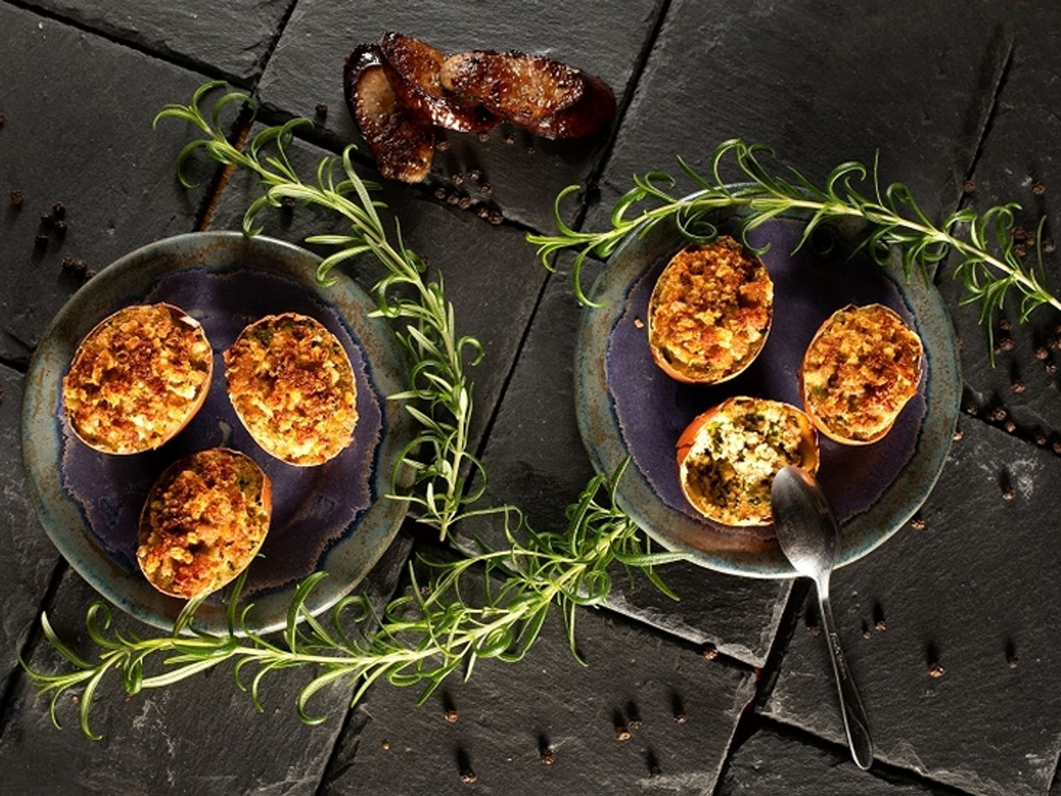 Ugotować 6 jaj na twardo. Ostudzić je i delikatnie przeciąć na pół bardzo ostrym nożem razem ze skorupką. Łyżeczką wybrać zawartość skorupek, uważając, aby ich nie uszkodzić. Drobno posiekać jajka. Obrać kiełbasę ze skórki i również drobno ją pokroić. Wymieszać kiełbasę z ugotowanymi jajkami, dodać łyżkę śmietany, łyżkę masła oraz jedno surowe jajko. Doprawić do smaku rozmarynem lub tymiankiem. Dodać ząbek czosnku wyciśnięty przez praskę. Całość dobrze wymieszać do połączenia się składników. Farsz przełożyć do skorupek i posypać rozdrobnioną, posiekaną kiełbasą. Rozgrzać niewielką ilość oleju na patelni. Połówki jaj położyć na patelni farszem do dołu, a skorupkami do góry i smażyć do zarumienienia. Podawać na półmisku udekorowane ziołami. Dla lepszego efektu można podsmażyć kilka plasterków kiełbasy i ułożyć miedzy faszerowanymi jajkami.
