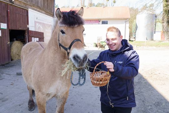 Na zdjęciu ogier Saturn urodzony 7 maja 2007 roku w towarzystwie Adama Wojtasa - pracownika ośrodka jeździeckiego (Fot. Aurelia Kołodziej/ZUT)