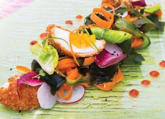 - Sałatkę wyłóż na półmisek, udekoruj listkami cykorii i ułóż ćwiartki jajek. Całość posyp prażonym sezamem.