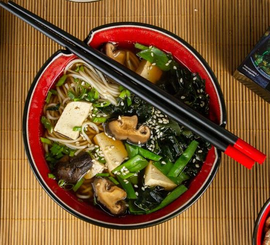 - Makaron przygotuj zgodnie z instrukcją na opakowaniu i wyłóż do misek, dodaj tofu i zalej zupą miso i udekoruj szczypiorem.