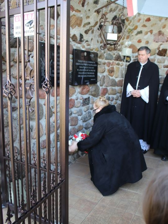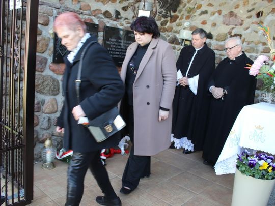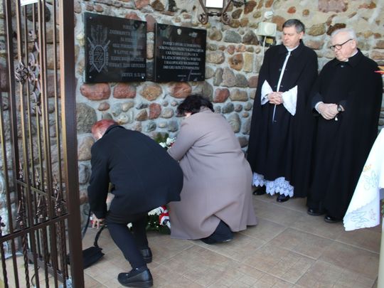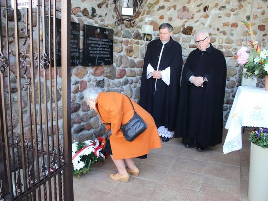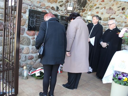 Po mszy delegacje organizacji patriotycznych złożyły wiązanki kwiatów i zapalone znicze pod tablicą katyńską w Grocie Maryjnej.