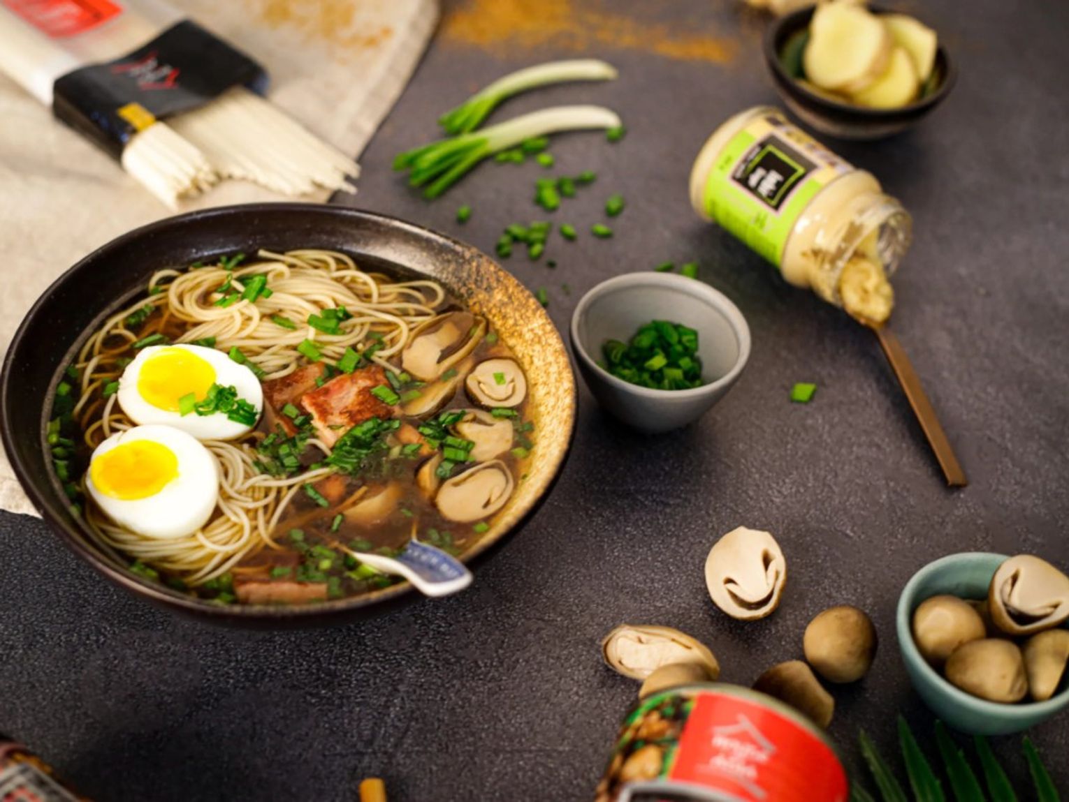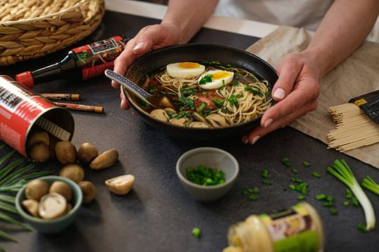- Do miseczki włóż makaron, grzyby, mięso, jajko i zalej bulionem. Dodaj dymkę i posyp sezamem.
