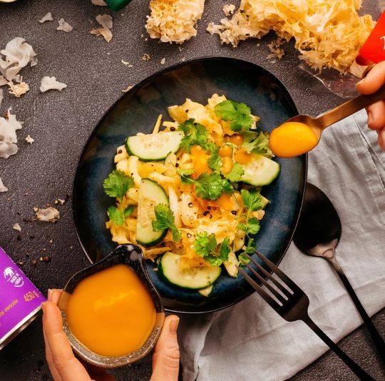 - Do miski przełóż grzyby, ogórka, cebulę i całość dokładnie wymieszaj z sosem mango.