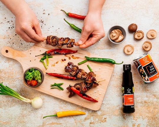 - Na patyczki do szaszłyków nadziej mięso, cebulę i grzyby. Smaż lub grilluj do miękkości mięsa. Co jakiś czas, za pomocą pędzelka, smaruj szaszłyki sosem Tonkatsu.