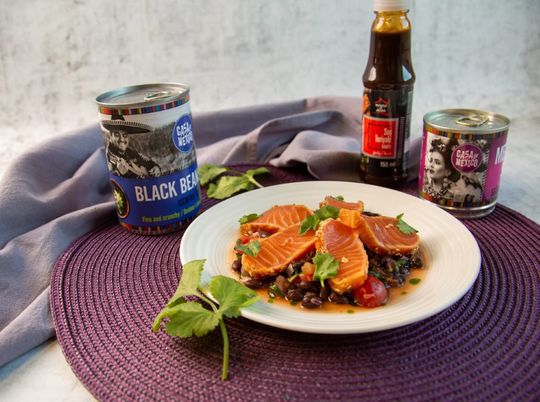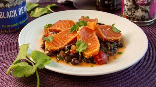 - Plastry łososia podawaj z sałatką z fasoli, a całość skrop sokiem z limonki.