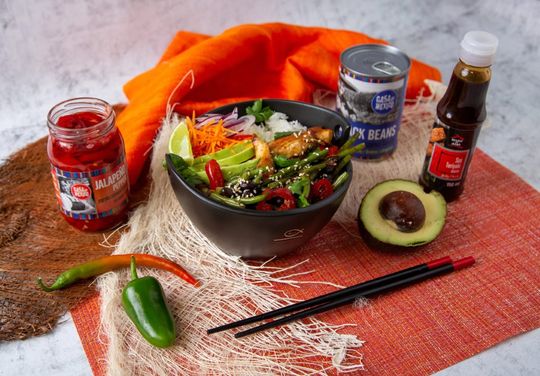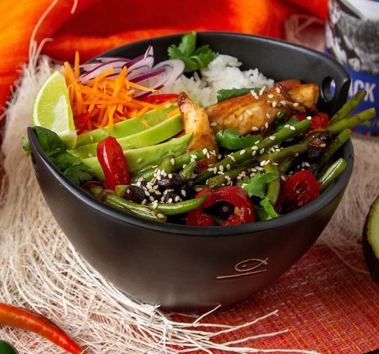 - Do miski przełóż ugotowany ryż, dodaj awokado oraz smażonego kurczaka z fasolą i cebulą. Całość posyp sezamem, kolendrą i pokrojonymi papryczkami jalapeno, skrop sokiem z limonki i olejem sezamowym.