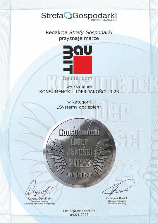 „Solidna firma, miałem już okazję stosować różne ich produkty, zawsze ta sama, wysoka jakość”, „szeroka oferta, atrakcyjne ceny”, „produkty, które spełniają 100% oczekiwań klienta, polecam”, „sprawdzona jakość, mają dobre opinie, firma, która ma duże doświadczenie w produkcji materiałów dociepleniowych” – to tylko niektóre z pozytywnych opinii wyrażonych w badaniu przez respondentów na temat marki Baumit. Takie recenzje zadecydowały o przyznaniu jej wyróżnienia „Konsumencki Lider Jakości 2023” w kategorii „systemy dociepleń”.