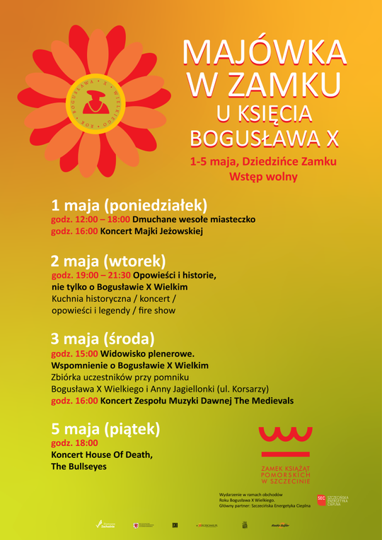 Wstęp na wszystkie wydarzenia jest bezpłatny. Majówka w Zamku odbywa się w ramach obchodów Roku Bogusława X Wielkiego. Główny partner: Szczecińska Energetyka Cieplna.