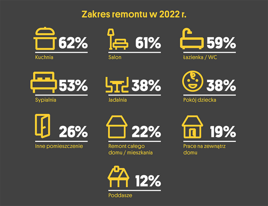 Według raportu „Jak remontują Polacy” na kompleksowy remont całego mieszkania czy domu zdecydowała się co piąta osoba. Najczęściej remontowanymi pomieszczeniami były kuchnia i salon. Są to pomieszczenia, w których najchętniej przyjmujemy gości, dlatego nie dziwi fakt, że są modernizowane w pierwszej kolejności. Na dalszych miejscach w remontowej hierarchii uplasowały się łazienka oraz sypialnia. Rzadziej przeprowadzano remont jadalni i pokoju dziecka (dzieci do 18. roku życia posiadała blisko połowa uczestników badania). Większość prac remontowych, bo aż 87%, obejmowała malowanie ścian i sufitów. Jest to zadanie, którego podejmujemy się często bez pomocy fachowca, a zmiana w pomieszczeniu jest wyraźnie widoczna. Można w ten sposób szybko odświeżyć pomieszczenie i nie jest to zbyt kosztowne.