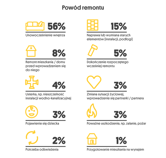 Dlaczego Polki i Polacy decydują się na zmianę aranżacji przestrzeni, w których żyją? Największą motywacją remontową jest chęć modernizacji i unowocześnienia wnętrz. To powód, dla którego 56% badanych postanowiło zmienić coś w swoich domach oraz mieszkaniach. Inną pobudką była konieczność naprawy lub wymiany starych elementów wykończenia, np. podłogi czy instalacji – przyczynę tę wskazało 15% uczestników badania. Respondenci sporadycznie jako przyczynę wskazywali również: remont mieszkania lub domu przed wprowadzeniem się do niego, dokończenie wcześniej rozpoczętego i z różnych względów przerwanego remontu, przygotowanie mieszkania na wynajem, zmiany sytuacji życiowej jak wprowadzenie się partnerki/partnera czy narodziny dziecka.