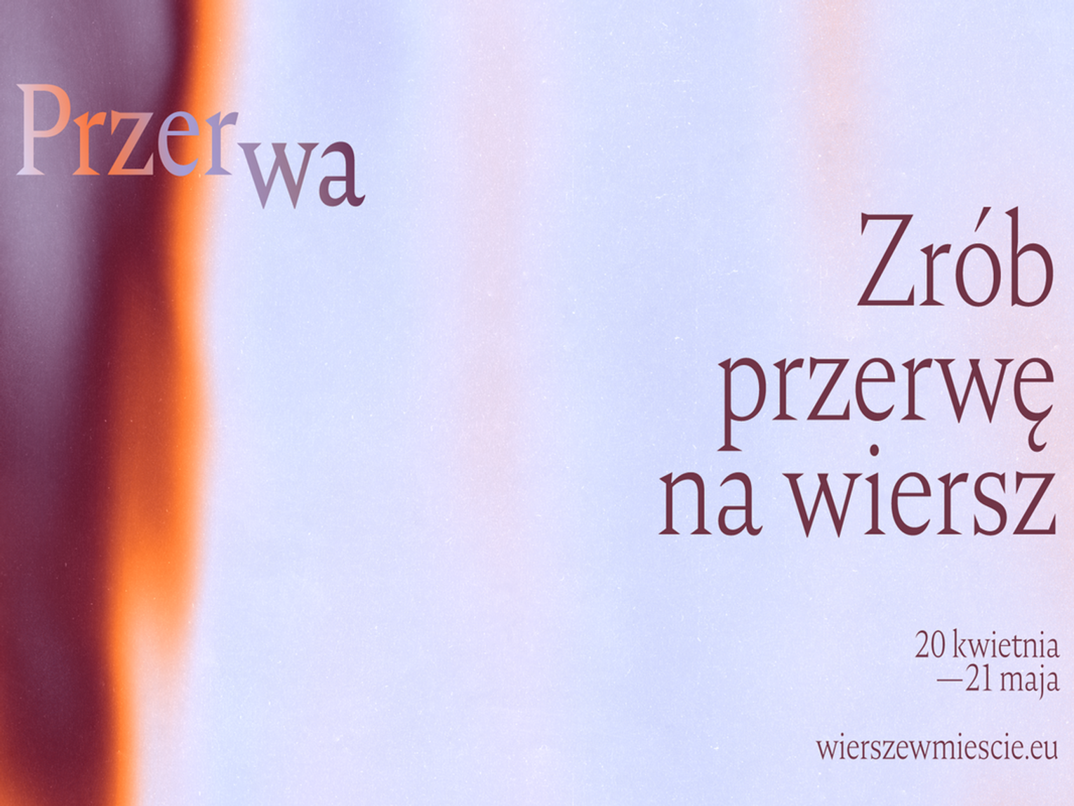 Trzeba przyznać rację Filipie Leal: „Życie jest bez przerwy” i nie weźmiemy od niego wolnego. Jednak nic nie nadaje mu takiej wyrazistości i pełni, jak momenty, w których zwalniamy tempo, łapiemy oddech i w codziennym biegu znajdujemy czas na najmniejszą nawet przerwę. Organizatorzy 7. edycji międzynarodowego festiwalu, który trwać będzie już tylko do 21 maja, wciąż namawiają do przerwy członkinie i członków społeczności skupionej wokół Wierszy w mieście. [MOU1] Na finał akcji kuratorka projektu, poetka Natalia Malek, laureatka Nagrody Literackiej Gdynia, zachęca do czytania, słuchania i oglądania najnowszych wierszy europejskich, a także prezentowania własnej twórczości.