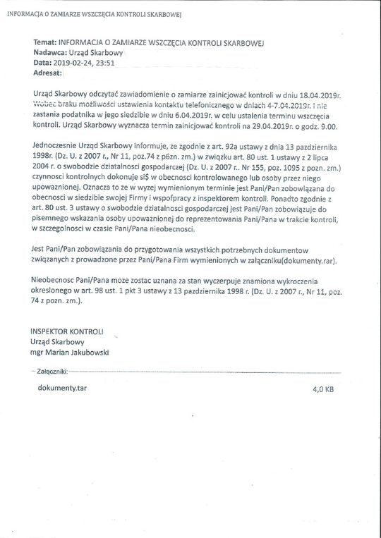 Do urzędów skarbowych woj. zachodniopomorskiego zgłaszają się podatnicy zaniepokojeni otrzymanymi mailami z informacją o wszczęciu kontroli skarbowej.