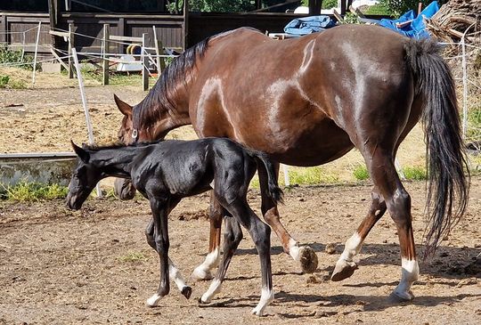 Mama i jej syn mają się bardzo dobrze, prawdopodobnie dziś lub jutro źrebak będzie miał okazję poznać swojego niewiele starszego kolegę - urodzonego 18 maja w AOJ, źrebaka Kansas Wine.