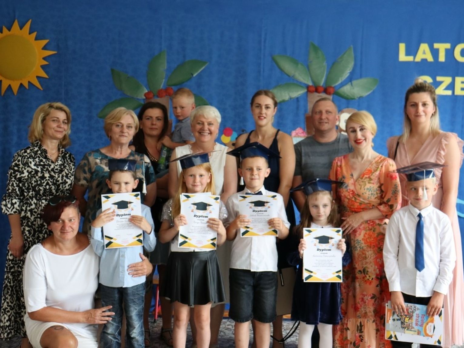 Po programie artystycznym pani dyrektor Marzena Stępień wręczyła pamiątkowe dyplomy i książki. Życzyła również wszystkim dzieciom wspaniałych, pełnych odpoczynku i relaksu wakacji, a starszakom, by następny etap ich życia był początkiem wspaniałej, pełnej sukcesów drogi. Podczas uroczystości nie zabrakło podziękowań złożonych przez rodziców Pani Dyrektor, nauczycielom i pracownikom szkoły. Po części oficjalnej dzieci ze swoimi rodzicami zaprosiły gości na pyszny tort.