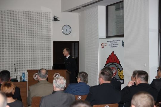 Komendant Powiatowy Państwowej Straży Pożarnej w Gryficach – st. kpt. Andrzej Gołdyn po serdecznym przywitaniu zebranych który przedstawił ogólną charakterystykę powiatu gryfickiego oraz strukturę organizacyjną oraz uwarunkowania działalności służbowej komendy w 2018 roku w tym podkreślił zakres i wagę współpracy z jednostkami OSP.