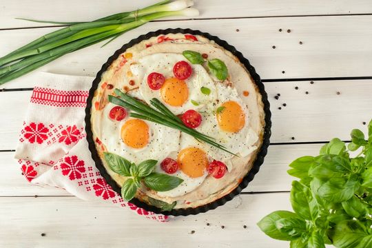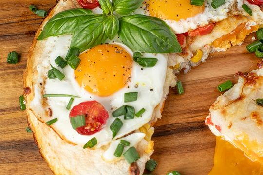 W porównaniu do innych produktów piekarniczych tortilla nie jest szczególnie kaloryczna (ok. 325 kcal), dlatego duże znaczenie mają dodatki, z którymi połączymy ten placek. Zamiast tłustego mięsa i sosów na bazie majonezu, warto zatem sięgnąć po zdrowe dodatki, bogate w składniki odżywcze i witaminy. W naszej warstwowej tortilli jest dużo warzyw i pożywna szynka, jednak jej podstawę stanowią jajka. To smaczny i wartościowy dodatek.