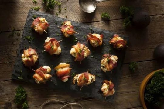 Na stole z przekąskami mogą znaleźć się zarówno proste krakersy z różnego rodzaju pastami, jak i bardziej fantazyjne roladki lub tartinki na kruchym spodzie. Miłośników wyrazistych i konkretnych smaków z pewnością przyciągną zawijasy pieczarkowo-serowe w wędzonym boczku.