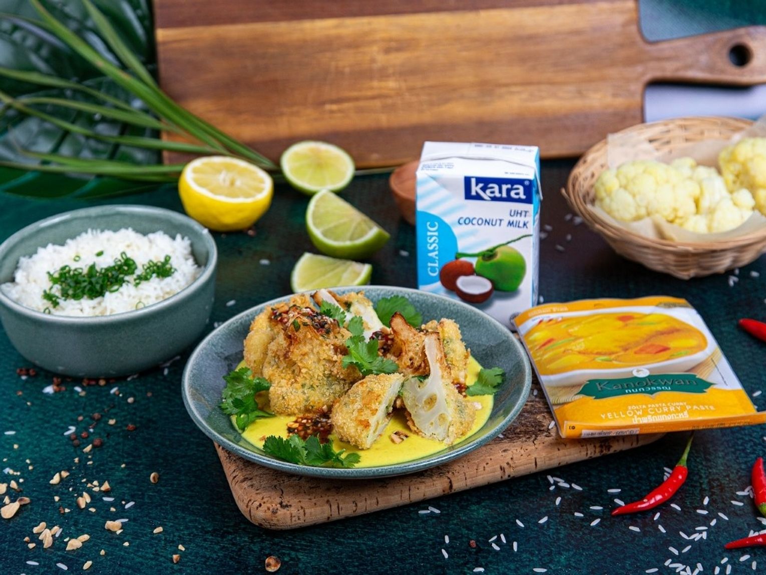 - Na rozgrzany wok wlej olej kokosowy i podsmaż kalafiora z cebulą, na rumiany kolor, dodaj pastę curry, pastę z imbiru i na końcu mleczko kokosowe.