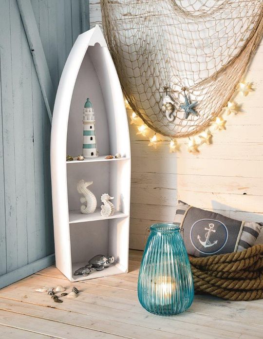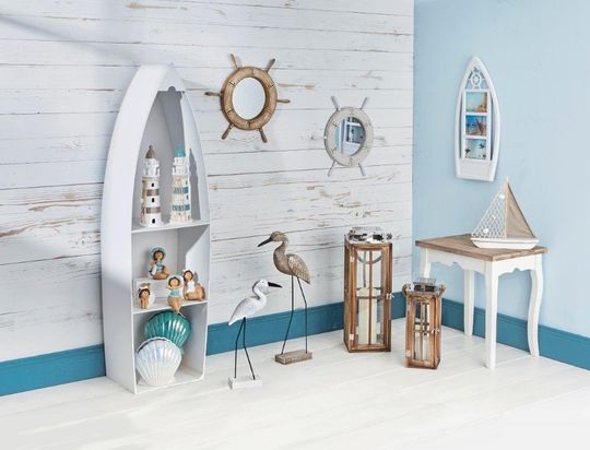 Jeśli wciąż będziemy czuli aranżacyjny niedosyt, to z taką bazą łatwo przejść do stylu marynistycznego. W praktyce oznacza to, że możemy dodać kilka typowo morskich elementów – np. wieszak w kształcie kotwicy, drewniane, przecierane lampiony czy poduszki w granatowo-białe pasy. Szafki i półki możemy ozdobić pamiątkami przywiezionymi z morskich wojaży – figurkami ryb, dekoracyjnymi muszlami czy wazonami, które przypominają ukwiały z oceanicznego dna. Morskie dekoracje znajdziemy w wielu sklepach w Polsce. Pamiętajmy jedynie, aby mnogość dodatków nie przytłoczyła jasnej przestrzeni.